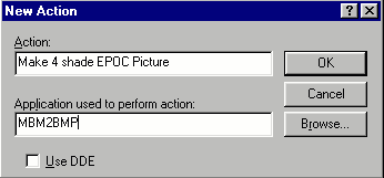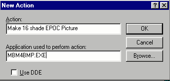 You can now repeat the process for conversions in the other direction. This is similar but slightly more complicated:- [When this article was first written, it only included the two convertors mentioned above. It has since been updated and now includes convertors for 16 colours (MBM16C.EXE), 256 colours (MBM256C.EXE) and 64K colours (MBM64K.EXE). These can be set up in a similar manner to the greyscale versions mention above.] If you prefer to use a graphics package, you may also like to try the freeware program XNView which supports EPOC picture formats directly.