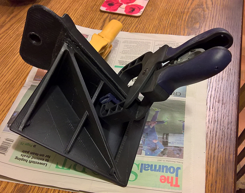 I have a spare PC that my sons sometimes use to play Elite Dangerous with me when they visit (and also as a backup for my main PC). The computer desk has very limited space and it's uncomfortable using the Saitek X52 HOTAS setup on it, so I designed up these mounts to fit the chair arms:-
